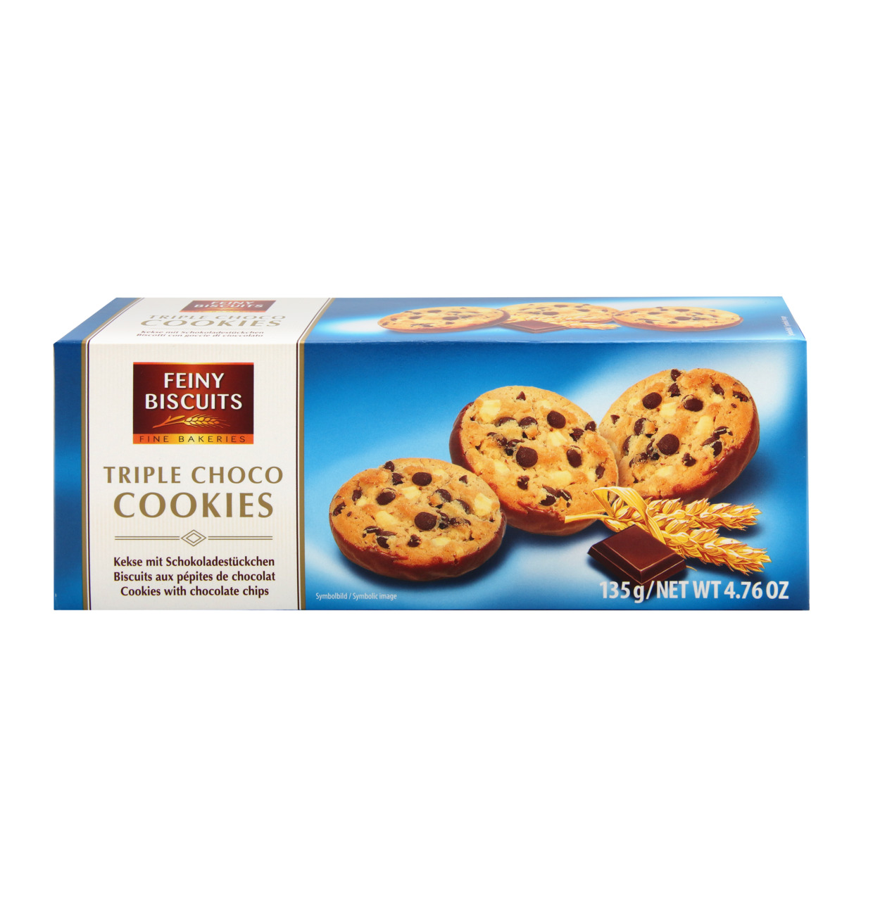 Cookies with milk chocolate-, chocolate- and white chocolate chips.